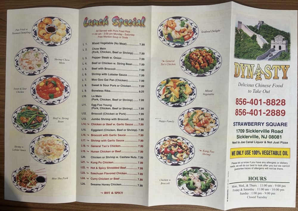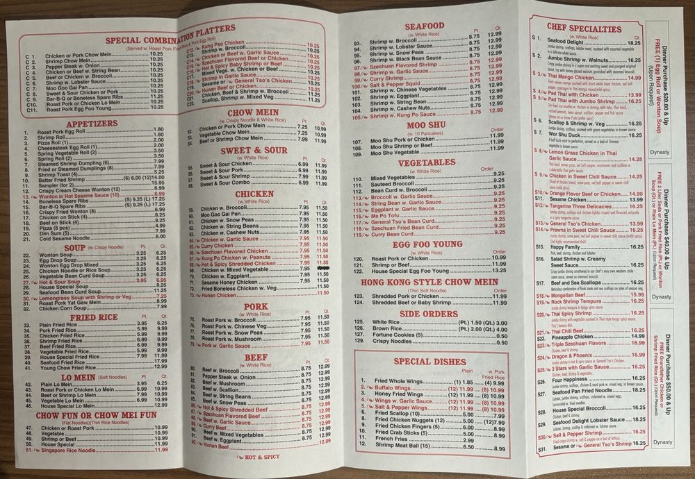Golden Dynasty Chinese Takeout is a Chinese restaurant located at 1709 Sicklerville Rd in Sicklerville, NJ. This establishment offers a variety of amenities such as delivery, takeout, reservations, catering, and waiter service. With a classy ambiance and moderate noise level, it is suitable for groups, families, and even kids. The menu features a wide range of appetizers including BBQ Spare Ribs, Batter Fried Shrimp, and Cold Sesame Noodles. Special Combination Platters like Chicken Chow Mein and Kung Pao Chicken are available for those looking for a complete meal. The Lunch Specials offer a selection of dishes like Mixed Vegetables, Hunan Beef, and Egg Foo Young. With options for every palate, Golden Dynasty Chinese Takeout promises a satisfying dining experience for all.